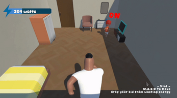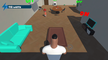 In Naughty Kid, the player takes on the role of a dad in a household setting. His children are running around the living room, mischievously turning on appliances such as lights, the TV, the air conditioner, and other household electronics. As the child continues to turn on appliances, the energy consumption in the house steadily increases.